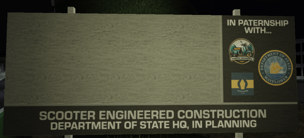 The Department of State is expected to receive an in-game headquarters after a recent update teased the potential release of one. The construction site is located on Vance Road, between McDoogle Plaza and the Mayflower State Police Headquarters. Nothing is known yet about the structure itself.
